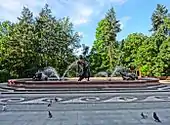 The second block figures a lonely bear crawling on the rock, its head facing east and its right paw raised. In its clenched jaws, the bear holds the dead body of a cub. The third part of the sculpture refers to the Greek mythology: it reminds of Laocoön legend, with a man fighting a sea serpent contortioned. Realistic details outline the efforts of the muscles and the tension of the struggle. The fountain is 6 m tall and made of bronze, with total weight of 9 tons. The circular pool wall is out of red sandstone, with some Silesian gray granite, the surrounding pavement is arranged in a mosaic.