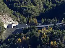 A second bore, parallel to the existing one at a distance of 50 m (55 yd), is under construction. Work began in 2009, following EU regulations put in place after the Mont Blanc Tunnel fire. Originally planned as an 8 m (26 ft) wide rescue tunnel, an agreement was reached in 2012 to open the new bore to traffic towards France while converting one lane of the existing bore into an emergency lane. The breakthrough occurred on 17 November 2014. The new bore is due to open to traffic in the autumn of 2023.[2] As there will still be a single lane for each direction (the other lane being an emergency lane), the capacity of the tunnel will remain unchanged. Both bores will be connected by a series of passages, five of which can be used by emergency vehicles.[3][4][5]