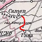 The last part, from Unna-Königsborn to Kamen was the responsibility of the Essen Division alone. Only half a year later, the line was completed on 1 November 1900 and opened for freight. Almost a year later, on 1 October 1901, the first passenger train ran between Unna and Kamen.[3]