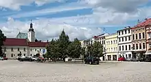 The historic centre of Místek is formed by Svobody Square, lined with preserved burgher houses with arcades.[7] Near the square is located the Church of Saint James the Great from 1622–1644. It replaced a wooden church consecrated to Saint Nicholas, which was first mentioned in 1582 and was destroyed by fire in 1602. The tower of the church is a landmark of Místek.[12]