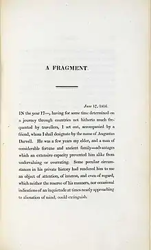 "Fragment of Novel" is an unfinished 1819 vampire horror story written by Lord Byron. The story, also known as "A Fragment" and "The Burial: A Fragment", was one of the first in English to feature a vampire theme. The main character was Augustus Darvell. John William Polidori based his novella The Vampyre (1819), originally attributed in print to Lord Byron, on the Byron fragment. The vampire in the Polidori story, Lord Ruthven, was modelled on Byron himself. The story was the result of the meeting that Byron had in the summer of 1816 with Percy Bysshe Shelley where a "ghost writing" contest was proposed.[1] This contest was also what led to the creation of Frankenstein according to Percy Bysshe Shelley's 1818 Preface to the novel. The story is important in the development and evolution of the vampire story in English literature as one of the first to feature the modern vampire as able to function in society in disguise.[2] The short story first appeared under the title "A Fragment" in the 1819 collection Mazeppa: A Poem, published by John Murray in London.