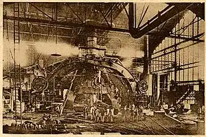 In 1826 the English partners Manby and Wilson acquired the iron forging mills at Le Creusot in 1826.[3] They employed Bourdon from 1827 to 1833 to run the workshop for maintaining the forges and tools.[1] Bourdon's first job was to modernize the works by installing the high-powered rolling mills needed to manufacture long lengths of rail for the railway lines in France.[3] In 1833 Bourdon traveled to the United States for three years to study the high-pressure steam engines used on the river boats there, including the engines built by the American engineer Oliver Evans. He learned many techniques during this trip.[4]