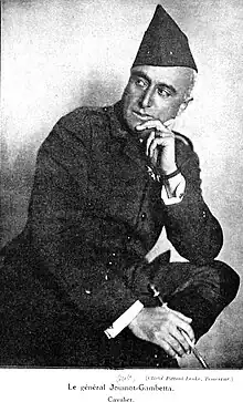 By the start of the First World War in 1914 Jouinot-Gambetta was a colonel.[1] He was appointed a commander of the Legion of Honour on 30 January 1915.[4]: 1 In 1917 Jouinot-Gambetta was appointed to command a brigade of three regiments of Spahis and Chasseurs d'Afrique with the Armée d'Orient on the Macedonian front.[1][7]