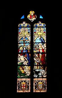 ![]() Stained glass relief showing the sieur de La Rochepot kneeling on the right, the arms of Montmorency are quartered with those of Pot on his tunic | |