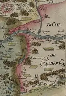 Border between the Messin country and Luxembourg in 1610, including the Luxembourgish enclave of Marange.