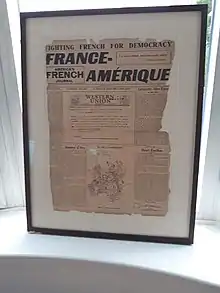 ![]() France-Amerique first newspaper, May 23, 1943. Charles de Gaulle wishes good luck to France-Amérique. This telegram is shown on the first page. | |
