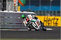 In 2015, Bagnaia made another team and bike change, this time joining Aspar Team on a Mahindra, with new teammates being Juanfran Guevara and Jorge Martín. In the fifth race of the season in France, Bagnaia got his first podium at Le Mans, finishing the race in 3rd place behind Romano Fenati and Enea Bastianini.[6] In the next race at Mugello Bagnaia finished 4th, missing the podium by 0.003 seconds. He was on his way to another podium finish at Silverstone but crashed with 2 laps remaining, fighting with Niccolò Antonelli for the 3rd place. Despite improving his championship position by two places, and gaining 26 more points than the previous year on a new bike for the third straight season, this time a Mahindra, it was still an up and down year for him. Bagnaia only finished in the top 10 during five races. He also missed points in seven races, unclassified in five of those. He finished the year 14th place in the championship standings, with 76 points.