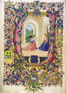 A miniature portrait of Federico da Montefeltro has him depicted on the left holding a book while looking at the man on the right, either the illuminator, Francesco, or the author, Cristoforo Landino. There is debate as to who the man on the right is due to little documentation or previous portraits of either Landino or Francesco. Vertova cites Francesco di Giorgio Martini as the artist, but mentions that sources differ on the painter, specifically mentioning Garzelli's book as having a different citation. Francesco di Giorgio Martini was of the same time period from Siena and was an accomplished architect, painter, sculptor, and military engineer. Although he was from Siena, Giorgio Martini had very Florentine qualities in his work which fueled the confusion between him and Di Antonio. His major paintings include the Coronation of the Virgin and A Women in a Stormy Landscape.[9] There was also some lesser speculation that the work was by Francesco Roselli, a student of Di Antonio's. It is commonly accepted that Francesco did illuminate all the borders of the book. Further evidence that he created the double portrait is that the two men in it are standing behind what looks like a window. The window frames the two men and cuts them off at the waist with a rug hanging over the sill. This is the rug that was previously mentioned for having and identical pattern to that of Piero Pallaiuolo. It was common for Francesco to put architectural aspects, such as this one, into his works.[6] Although there is controversy on the particular work, the majority of sources site Francesco di Antonio del Chierico as the artist.