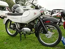 Francis Barnett was amalgamated with Associated Motor Cycles in 1947. About that time Francis Barnett brought back the Cruiser names with a 171cc AMC engined Light Cruiser.[5] The motorcycles Plover, Falcon and Cruiser were successful right into the 1950s as good light machines in Arden Green rather than the black finish of earlier days. James vehicles were in maroon. AMC considered Wolverhampton based Villiers to be dictatorial and they commissioned Italian designer Vincenzo Piatti to design a new engine to replace the Villier' engine. The Villiers engine was discontinued in new models in favour of AMC's Piatti designed unit. Unfortunately this did not work well due to cost and unreliability of the AMC manufactured engine.[18] AMC reverted Francis Barnett bikes back to a Villiers engine again.[19] The Falcon 87 with a 199cc single cylinder two stroke AMC engine was introduced and remained in production until 1966. Also that year the Cruiser 84 with a fully enclosed rear wheel and leg shields as standard equipment was available. The first Cruiser was made in 1932 and is a quiet machine made for riders where special wet proof clothing was not required. The engine being enclosed with good leg-shield and mudguard protection. The Cruiser is displayed at Lord Montague's National Motor Museum, Beaulieu.[20][21]