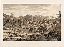 After leaving high school he was for a time sheepfarming and with his brother, but the life was not congenial and he decided to go to Australia.[4] He arrived in Melbourne on 10 April 1852, a few months after the gold discoveries.[4] He paid a brief visit to Sydney, having a runaway convict from Norfolk Island as a mate, but returned at once to Melbourne, where there was much talk of gold and the diggings.[4] Hare joined a party of visitors, and an eight days' tramp brought them to Bendigo, passing en route through the Black Forest, then a noted haunt of bushrangers.[4] They pitched their tents at Golden Gully, and had a fair amount of luck as gold seekers.[4] Alluring news came across from the Ovens and Hare and his party decided to go there, although on the day before he left Hare had himself washed out 10 ounces (283 grams) of gold in a little gully not far from their tents.[4]