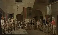 Greenway was born in Mangotsfield, Gloucestershire (near the English city of Bristol), the son of Francis Greenway and Ann Webb.[3] Greenway became an architect "of some eminence" in Bristol and Bath. His only remaining building in the United Kingdom is the Clifton Club in Bristol, originally the Clifton Hotel and Assembly Rooms. In 1809 he became bankrupt and in 1812 he pleaded guilty "under the advice of his friends", to forging a financial document, and was sentenced to death; this sentence was later commuted to 14 years' transportation. Why he pleaded guilty is unknown; he may have been told it was the only way to save his life. Whilst awaiting deportation to Sydney, Greenway spent time in Newgate Prison, Bristol, where he completed paintings depicting scenes within the prison.[4]