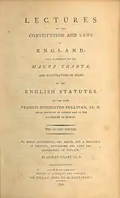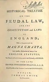 - ↑ Francis Stoughton Sullivan (1772), An Historical Treatise on the Feudal Law, and the Constitution and Laws of England: With a Commentary on Magna Charta, and Necessary Illustrations of many of the English Statutes, in a Course of Lectures, Read in the University of Dublin. By the Late Francis Stoughton Sullivan, LL.D. Royal Professor of the Common Law in that University (1st Irish ed.), Dublin: Thomas Ewing, OCLC 776548497.