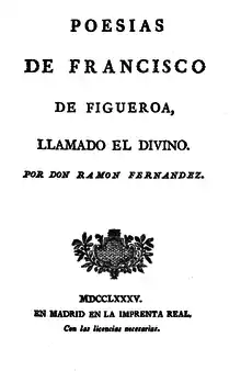 Francisco de Figueroa (c. 1530 – c. 1588) was a Spanish poet best known for his love sonnets and his bilingual compositions in Spanish and Italian. Born in Alcalá de Henares, Figueroa spent his early years in Alcala, studying under Spanish humanist Ambrosio Morales, and traveled to Italy at an early age (we find him in Siena in 1552).