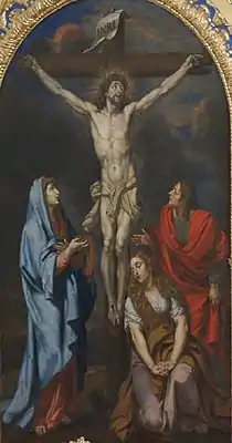 His altarpieces are in a style, which mixes Flemish, Venetian and Roman classical models derived from Rubens, Raphael, Titian, Tintoretto, Poussin and Pietro da Cortona. Notable is the Flemish surface realism, a colouring in differentiated brown and red tones, which evolved to more red colours toward the 1680s and changed to a mellow tone with more pink colours towards the end of his residence in Central Europe. The colour schemes of his oil paintings as well as his portrait art, which has mainly been preserved in copper engravings, were highly regarded by his contemporaries.[1]