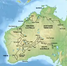 By 1895 economic conditions had taken a downturn resulting in Hann walking off the station. He decided to try his luck in the north of Western Australia, so in 1896 with six Aboriginal companions and 67 horses he travelled overland from Lawn Hill to Halls Creek. Once in the west, despite being more than 50 years old, he carried out numerous expeditions partly financed by the government. In 1897 from a base at Nullagine, Hann explored the east Pilbara, and noticed creeks in the area flowed inland. He followed them expecting to find a large fresh water lake, but to his disappointment the lake turned out to be salt. Consequently, he named the feature Lake Disappointment.[3]