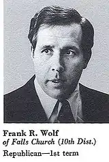 Frank Rudolph Wolf (born January 30, 1939) is an American politician who served as the U.S. representative for Virginia's 10th congressional district from 1981 to 2015. A member of the Republican Party, he announced in December 2013 that he would not run for reelection in 2014. Wolf retired at the conclusion of his 17th term in office, in January 2015.[3] At the time of his retirement, he was the dean of the state's congressional delegation, having served for 34 consecutive years.[4]