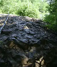 Ancient basalt lava along the shore of Haledon Reservoir
