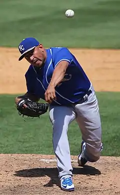 Morales signed a minor league deal with the Kansas City Royals on February 19, 2015 and made the team out of spring training.[6] He got his first win with the team on April 19, throwing the final two pitches of an at bat to Brett Lawrie after Kelvin Herrera was ejected for throwing at Lawrie.[7] Morales finished the 2015 season with a 3.18 ERA and a 4-2 record in 67 relief appearances. With the Royals finishing the season 95-67, the team clinched the AL Central and eventually won the 2015 World Series against the New York Mets, their first championship in 30 years. It was the second championship Morales won in his career.