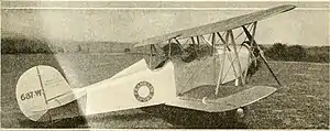The Sport is a single bay, unequal span biplane. Its wings are built around twin spruce spars and, like the rest of the aircraft, fabric covered. Upper and lower wings have the same chord and outward-leaning, N-form interplane struts between their spars provide a wide interplane gap of about 50 in (1,300 mm). The upper wing is without dihedral but the lower, equipped with Frise ailerons, is set at 2°. Both wings are rectangular in plan out to rounded tips though the upper wing, held centrally over the fuselage on a cabane, has a semi-circular cut-out to increase the pilot's upwards field of view.[1]
