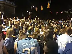 - Victory celebrations: While students previously held "Beat Duke" parades on Franklin Street before sporting events,[13] today students and sports fans have been known to spill out of bars and dormitories upon the victory of one of Carolina's sports teams.[14] In most cases, “rushing” Franklin is due to a victory by the men's basketball team,[15][16] usually over Duke with Blue Devils gear as the fuel, although other Franklin Street celebrations have stemmed from wins by the women's basketball team and women's soccer team. Upon the event the men's basketball team reaches the national championship game, local stores are known to halt sales of Carolina-blue paint to avoid a repeat of the 1982 jamboree which resulted in Franklin Street being painted blue by celebrating fans. On April 6, 2009 after winning the men's basketball national championship, over 45,000 UNC fans and students crowded Franklin Street. And on April 3, 2017, more than 55,000 fans rushed Franklin Street to celebrate another men's basketball national title.