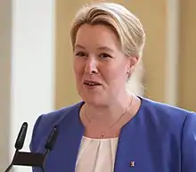 Franziska Giffey (German: [fʁanˈtsɪska ˈɡɪfaɪ̯], née Süllke, born 3 May 1978) is a German politician of the Social Democratic Party (SPD) who is serving as Berlin State Senator for Economy, Energy and Enterprise since 2023. She served as Governing Mayor of Berlin from December 2021 to April 2023.[1][2] She previously served as Minister for Family Affairs, Senior Citizens, Women and Youth in the government of Chancellor Angela Merkel from 2018 until 2021.[3][4] From 2015 to 2018, she was the mayor of the borough of Neukölln in Berlin.[3][5]