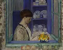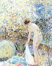 In the summer of 1905, he spent at least a month in the Giverny art colony.[12] In October of that year he married Sarah Anne O'Bryan[13] (known as Sadie),[14] whom he had met seven years earlier.[15] Frieseke and his wife (and later, their daughter) spent every summer from 1906 to 1919 in Giverny.[4] He kept a Paris apartment and studio throughout his life,[8] and the Friesekes spent the winters in Paris.[16] Their Giverny house, previously the residence of Theodore Robinson, was next door to Claude Monet's. Despite the proximity, Frieseke did not become close friends with Monet, nor was Monet an artistic influence.[11] He said in an interview, "No artist in [the impressionist] school has influenced me except, perhaps, Renoir."[2] Indeed, Frieseke's paintings of sensually rounded figures often bear a resemblance to those of Pierre-Auguste Renoir.[11]