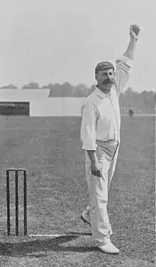 Between 1889 and 1891 Martin was considered in his prime and one of the best left-arm bowlers in the country.[3][11] He took 87 wickets for Kent in 1889 and 106 in total, the first time he had taken over 100 wickets in a season.[2][12] He followed this with 190 wickets in 1890, with 105 for Kent including a hat-trick against Surrey at The Oval, and 140 in 1891, again taking 105 for Kent.[upper-alpha 2][2][4][13] He played his only home Test match for England in 1890 and was named as one of the Wisden Cricketers of the Year in the 1892 edition of the almanack.[8][11]