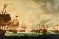 In February 1782, during the American War of Independence, Admiral Sir George Rodney sailed again for the West Indies after a period of leave, and Thesiger gained a commission as acting-lieutenant on board HMS Formidable. He caught the eye of Admiral Sir Charles Douglas, captain of the fleet, and on his recommendation he was appointed as flag lieutenant to Rodney on the eve of the last day of the Battle of the Saintes.[1] Thesiger went on serving with the fleet on the Leeward Islands Station under Admiral Hugh Pigot, and later went with Douglas when he was appointed to command the North America and West Indies Station at Halifax, Nova Scotia. The American war was ended by the Treaty of Paris in September 1783, and Thesiger returned to shore leave in England.[1]