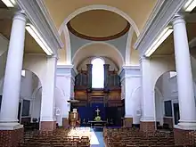 The church has a low concrete dome, by contrast to the spire of St Jude's. The interior features Tuscan columns with brick plinths, and a barrel vault. The interior is in pastel colours.[2] The church has two war memorial panels designed by Percy Delf Smith.[4]