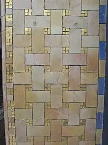 The "striking"[2] and "spectacular"[13] restaurant section, added as part of the "famous facelift"[13] of 1928, has been described as "reminiscent of the Viennese Secession".[2] The three-bay exterior is framed by a two-storey gold and blue mosaic with gold lettering at the top, reading freemasons restaurant and kemp town brewery. The dado has gold Masonic symbols, and the lettering at the top is framed by two Stars of David;[2][3][13] below these, there are a pair of gold figures in the form of chimera, with a griffin- or fish-style head and a curved body like that of a seahorse.[3][13] Below the mosaic frame, a two-storey glazed bronze screen with metal framing leads to a recessed doorway. Some of the glass is leaded with sunburst forms. Paired bronze lamp-holders project from the entrance.[3][13] At second-floor level, there is a modern three-part window.[3] Inside, much of Denman & Son's Art Deco work survives. There are moulded beams and friezes with swag motifs, integral seating and other furniture, Art Deco lighting, decorative plasterwork and an original staircase.[2][3]