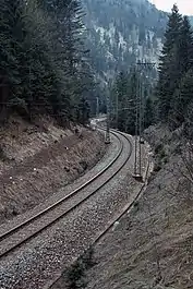 There used to be a 70-metre-long tunnel on a curve near the former Gmundbrücke station at Tristram Gorge. Its profile was too restrictive to allow the introduction of 4-axle carriages, so in 1933/34 it was opened out to form a cutting.[2]