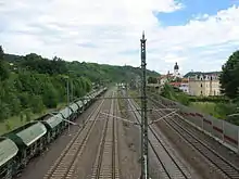 Freital-Potschappel station is a station on the Dresden–Werdau railway in the district of Potschappel of the municipality of Freital in the German state of Saxony. From 1884 to 1972, the station was the starting point of the 750 mm gauge Freital-Potschappel–Nossen railway. Today, Freital-Potschappel serves in particular as an access point to line S3 of the Dresden S-Bahn.