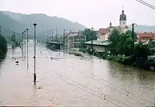 Since 31 May 1992, Freital-Potschappel station has been served by the Dresden S-Bahn. The flood in August 2002 caused devastating damage to the tracks, so that in the following years extensive repairs and new works had to be carried out. The platform and a bridge north of the station were moved somewhat to the southeast, but the abutments of the old building including the entrance to the platform were preserved. During the reconstruction work, large parts of the PHV line were also dismantled so that a continuous narrow-gauge link between Hainsberg and Potschappel no longer exists. The carriages of the Weißeritz Valley Railway and those of the Radebeul–Radeburg railway (Lößnitzgrundbahn) have since then been transported by low-loader to the carriage repair shop in Potschappel.