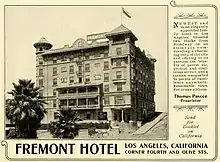 - ↑ "The Fremont Hotel (Part 1) - 401 South Olive Street". On Bunker Hill organization. 20 August 2008. Retrieved 28 April 2013.