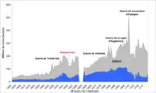 The gross revenue for the poll tax was 21 million livres in 1695, which after deductions for miscellaneous expenses and moderations granted to provinces, cities and individuals amounted to a net income of 19 million livres. In 1696 the gross income amounted to 23 million livres, the contribution from the clergy not included. In 1697 the gross income was 24 million with the contribution of the clergy included. The total contributions for the three years may be estimated to 67 million livres.[10]