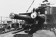 The following year, she became a gunnery training ship at Toulon,[4] but she suffered a serious boiler fire on 6 June 1923 that required repairs, so she was given the first of her modernisations between 9 July 1923 and 16 April 1924, at La Seyne-sur-Mer. This included replacing four boilers with oil-fired du Temple boilers and trunking together her two forward funnels. The maximum elevation of the main armament was increased from 12° to 23° which increased their maximum range to 26,000 metres (28,000 yd). Her existing AA guns were replaced with four 75 mm Modèle 1918 AA guns, and her bow armour was removed to make her more seaworthy. A new tripod foremast with a fire-control position at its top was fitted. A Barr & Stroud 4.57-metre (15 ft) rangefinder was positioned on the roof of the fire-control position and an experimental Barr & Stroud FX2 7.6-metre (24 ft 11 in) coincidence rangefinder was installed on the roof of the aft superfiring turret, replacing the 2-metre (6 ft 7 in) instrument inside the turret. She had another boiler fire on 1 August 1924, burning 13 men, of whom 3 later died of their wounds, and remained under repair for the rest of the year.[17]