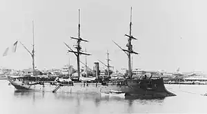 The ship was taken out of service later in 1886 for a reconstruction of her propulsion system; work lasted into 1889.[3] The following year, Rigault de Genouilly was stationed at Brest, along with the protected cruiser Sfax and the unprotected cruiser Primauguet. The three cruisers were mobilized on 20 June to take part in the fleet maneuvers held that year. Rigault de Genouilly was assigned to the 4th Division of the 2nd Squadron of the Mediterranean Fleet, along with the ironclads Bayard, Vauban, and Duguesclin. The ships concentrated off Oran, French Algeria on 22 June and then proceeded to Brest, arriving there on 2 July for combined operations with the ships of the Northern Squadron. The exercises began four days later and concluded on 25 July, and during part of the maneuvers, Rigault de Genouilly and Primauguet represented the hostile fleet.[8][9] In 1891, the ship was assigned to the Flying Division of the Atlantic.[10]