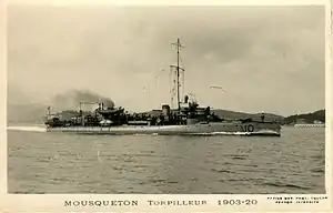 When the First World War began in August 1914, Mousqueton was a leader (divisionnaire) in the 2nd Submarine and Destroyer Flotilla (2e escadrille sous-marins et torpilleurs) of the 1st Naval Army (1ère Armée navale),[6] based at Bizerte, French Tunisia.[4]