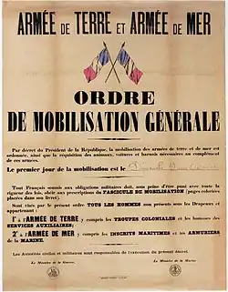 All of those decisive moves and countermoves took place while Poincaré was slowly returning to Paris on board a battleship. Poincaré's attempts while afloat to communicate with Paris were blocked by the Germans, who jammed the radio messages between his ship and Paris.[29] When Vienna's ultimatum was presented to Serbia on 23 July, the French government was in the hands of Acting Premier Jean-Baptiste Bienvenu-Martin, the Minister of Justice, who was unfamiliar with foreign affairs. His inability to take decisions especially exasperated the Quai d'Orsay (the French Ministry of Foreign Affairs). Senior diplomat Philippe Berthelot complained that France was doing nothing while Europe was threatened with the prospect of war.[30] Realising that Poincaré was practically incommunicado, the French military command began issuing orders in preparation for its own mobilization in defense against Germany, and it ordered French troops to withdraw 10 km (6.2 mi) from the German border not avoid being provocative. The French war plan called for an immediate invasion of Alsace-Lorraine and never expected that the main German attack would come immediately and come far to the north, through neutral Belgium.[31]