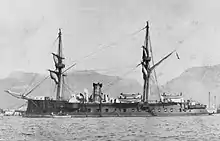 Her main battery consisted of four 240 mm (9.4 in), 19-caliber M1870M guns mounted in individual barbette mounts, two forward placed abreast, and two aft, both of the latter on the centerline. She carried a 194 mm (7.6 in) 19,8-cal. M1870 gun in the bow as a chase gun. These guns were supported by a secondary battery of six 138.6 mm (5.46 in) 21.3-cal. M1870 guns carried in a central battery located amidships in the hull, three guns per broadside. For defense against torpedo boats, she carried twelve 37 mm (1.5 in) 1-pounder Hotchkiss revolver cannon, all in individual mounts. Her armament was rounded out with two 356 mm (14 in) torpedo tubes in above-water launchers forward of the central battery. She also carried a pair of 65 mm (2.6 in) field guns that could be sent ashore with a landing party.[6][5] In 1889, the ship received a pair of 47 mm (1.9 in) guns in place of two of the 37 mm guns, and by 1893, a further four of the 47 mm guns were added.[5]