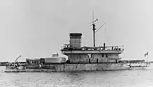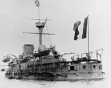 Her main armament consisted of two 340 mm (13.4 in), 21-caliber guns mounted in individual barbette mounts, one forward and one aft, both on the centerline.[6] Ammunition storage was intended to be eighty rounds per gun, but the need to save weight forced a reduction to forty shots per gun.[9] For defense against torpedo boats, she carried four 47 mm (1.9 in) 3-pounder guns and ten 37 mm (1.5 in) 1-pounder Hotchkiss revolver cannon, all in individual mounts. Her armament was rounded out with two 356 mm (14 in) torpedo tubes in above-water mounts.[6]
