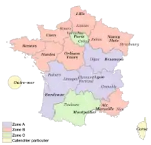 The three zones (A, B and C) dictate when a school at a particular location will have its holiday. The zones are not contiguous areas of France, but are designed to split the population evenly.