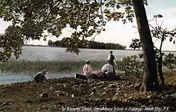 Picnicking on Dunhams Island with Frenchman Island in distance, c. 1910.