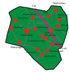 Besides the main town, which bears the same name as the whole municipality, there are sixteen outlying centres named Alchen, Bottenberg, Bühl, Büschergrund, Dirlenbach, Heisberg, Hohenhain, Lindenberg, Mausbach, Niederheuslingen, Niederholzklau, Niederndorf, Oberfischbach, Oberheuslingen, Oberholzklau and Plittershagen. Among these, the main town is the biggest, and the next in size after that is Büschergrund, which is itself further subdivided into four parts, named Büschen, Eichen, Anstoß and Bockseifen.