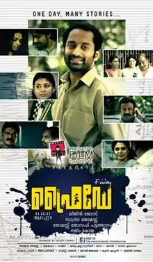 Friday is a 2012 Malayalam drama thriller film directed by Lijin Jose and starring Fahadh Faasil and Ann Augustine. Fahadh does the role of an auto rickshaw driver. The supporting cast includes Nedumudi Venu, Vijayaraghavan and Tini Tom. Produced by Sandra Thomas and Thomas Joseph Pattathanam under the banner of Innovative Film Concepts, the film is set and shot completely in Alappuzha. It released on 18 August 2012 to positive critical reviews.[1] Carrying a tag of One Day-Many Stories; the film has a multi-narrative aspect and is woven in the format of a hyperlink cinema.[2]