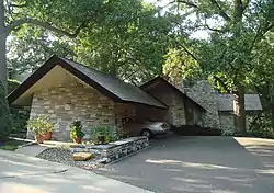 The house was designed in Wright's post-World War II Usonian architecture, with the goal of "affordable, beautiful housing for a democratic America." The L-shaped, one-story home's floor plan features a dominant living room and social and spatial separation into "active" and "quiet" areas.[4] The short side of the L consists of the "active" portion, centering on a living room with 17-foot (5.2 m)-high vaulted ceiling and views of Cedar Lake; the "quiet" portion is the long side ending in a three-car carport and has bedrooms as well as a gallery leading to a hidden main entrance.[1]