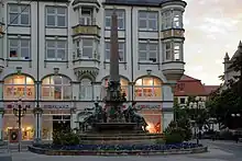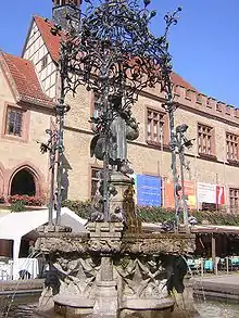 Stöckhardt is especially known for his fountain designs. In 1882 he had already won the competition for the Mendebrunnen in Leipzig, but remained unconsidered. In 1890 two important fountains were inaugurated, in Erfurt at the city's main place Anger,[4] and in Dessau a fountain monument memorizing Moses Mendelssohn.[5] Stöckhardt's best known work, however, followed in 1901. The Gänseliesel fountain is today Göttingen's landmark.