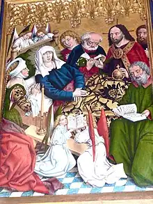Friedrich Herlin (c. 1425/30 – 1500) was a German painter. His earliest known work, depicting scenes from the Life of the Virgin, is dated 1459. A signature on an altarpiece in Nördlingen, dating it to 1462, identifies him as being from Rothenburg ob der Tauber, as do citizenship documents from 1467. Nevertheless, it is possible that he lived there for only a short time, and that his origins lie in Ulm, where a painter named Hans Herlin lived and worked from 1449 until 1468. Stylistically, he borrowed much from Rogier van der Weyden, indicating a great deal of familiarity with the art of the Netherlands and of Cologne. The sculpture attached to the altarpiece of 1462 in the St. George church, though officially listed as by the so-called "Master of Nördlingen", has been tentatively ascribed to Nicolaus Gerhaert, which if true would indicate extensive contacts to the highest artistic circles of the era.