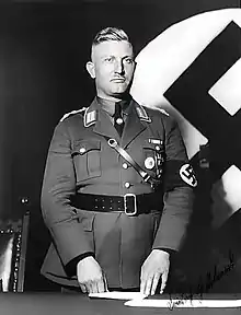 Briefly suspended as Gauleiter by Rudolf Hess in July 1930 for criticism of Adolf Hitler's alliance with industry, Hildebrandt was reinstated on 31 January 1931 after making a declaration of loyalty to Hitler.[4] He was elected to the Reichstag in September 1930 as a deputy for electoral constituency 35 (Mecklenburg) and served there until the fall of the Nazi regime. After the Nazi seizure of power, he was named Reichskommissar for the Free States of both Mecklenburg-Schwerin and Mecklenburg-Strelitz on 24 March 1933. He was subsequently elevated to the new post of Reichsstatthalter (Reich Governor) of Mecklenburg-Schwerin, Mecklenburg-Strelitz and the Free City of Lübeck on 26 May 1933. He thus united under his control the highest party and governmental offices in his jurisdictions. On 1 January 1934, the two Free States were combined into a unified Mecklenburg. From 1933 to 1934, Hildebrandt also served as the leader of the Nordische Gesellschaft (Nordic Society), which sought to strengthen German-Nordic cultural and political cooperation. He was also made a member of Hans Frank's Academy for German Law in 1935. On 1 April 1937, the Greater Hamburg Act transferred the City of Lübeck to Gau Schleswig-Holstein and Hildebrandt's Gau was renamed Gau Mecklenburg.[5]