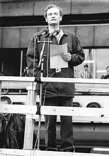 When, in 1968, Alexander Dubček tried to reform communism in Czechoslovakia in the Prague Spring, Schorlemmer and his friends not only sympathized with that development but also spread information about it.[3] In the 1970s and 1980s, he worked for environmental, human rights and peace groups.[4] The department "Political Underground" of the State Security Service (Stasi) put him under observation.[5] He was responsible for a symbolical act at the Protestant Church Congress (Kirchentag) in Wittenberg on 24 September 1983, in which a sword was turned into a ploughshare by Stefan Nau, a local blacksmith.[6][7] The State Security Service did not interfere because the future West German President Richard von Weizsäcker, who was then Mayor of West Berlin, attended the Congress as a representative of the Council of the Protestant Church in Germany, and the Western media reported about it.[8]